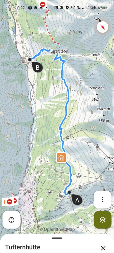 周りを見ると「冬は閉鎖するでー」という看板が立っていたり、アプリのmap上に通行止めマークもあったので引き返すべきですね。ちなみにアプリ名は「Outdooractive」です。