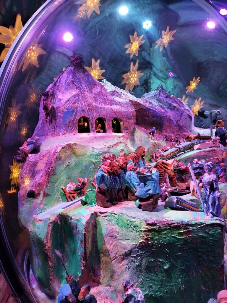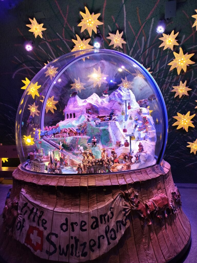 これはユングフラウを模したオブジェでしょうか。電車やゴンドラは動きますし、鳩時計のように洞窟から人形が出てきたりします。これは足が止まっちゃいます!