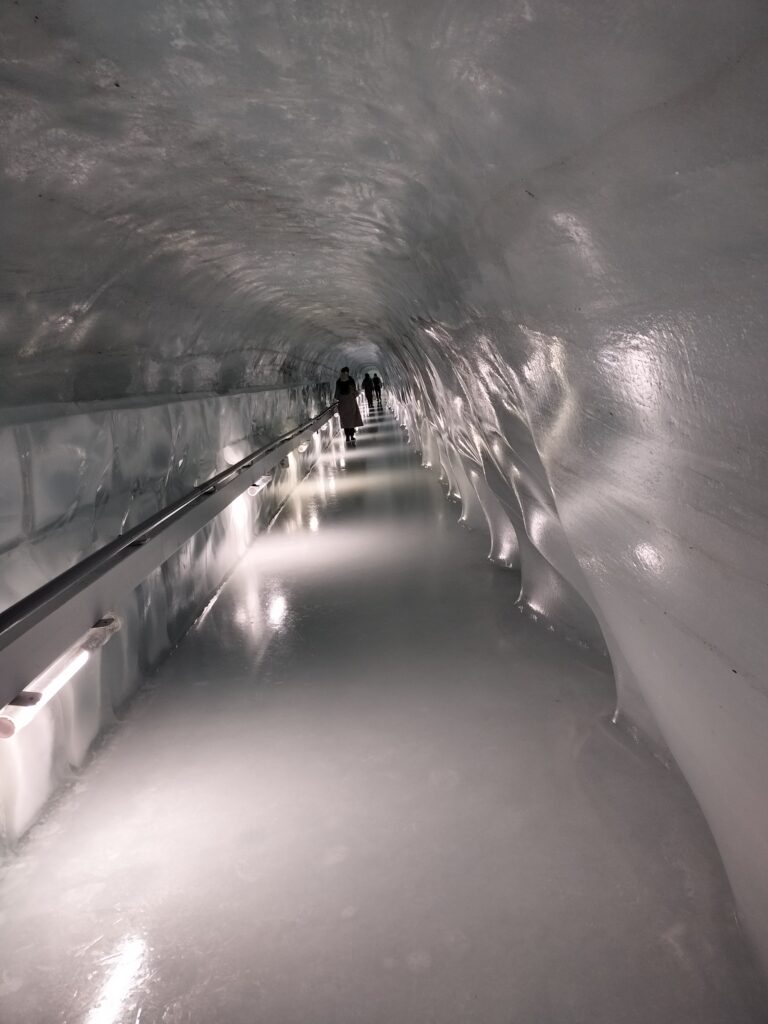 そして、ここが噂の氷の宮殿!年間15cm動くようで、そのたびに修復工事をしているなんてすごいですよね。当たり前ですけど滑りますし、触ると冷たいです。