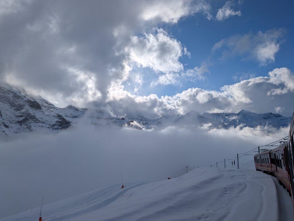 なんとかメンヒの頂上だけ写真に収めることができました!ユングフラウは残念ながら雲に隠れてしまい、撮れませんでした😭